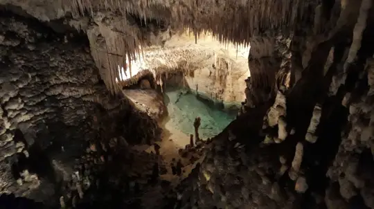 Al entrar, los visitantes avanzan por salas amplias cubiertas de estalactitas —largos “carámbanos” de piedra que cuelgan del techo—. Al final del recorrido llega la sorpresa: una sala con lago y música en directo.