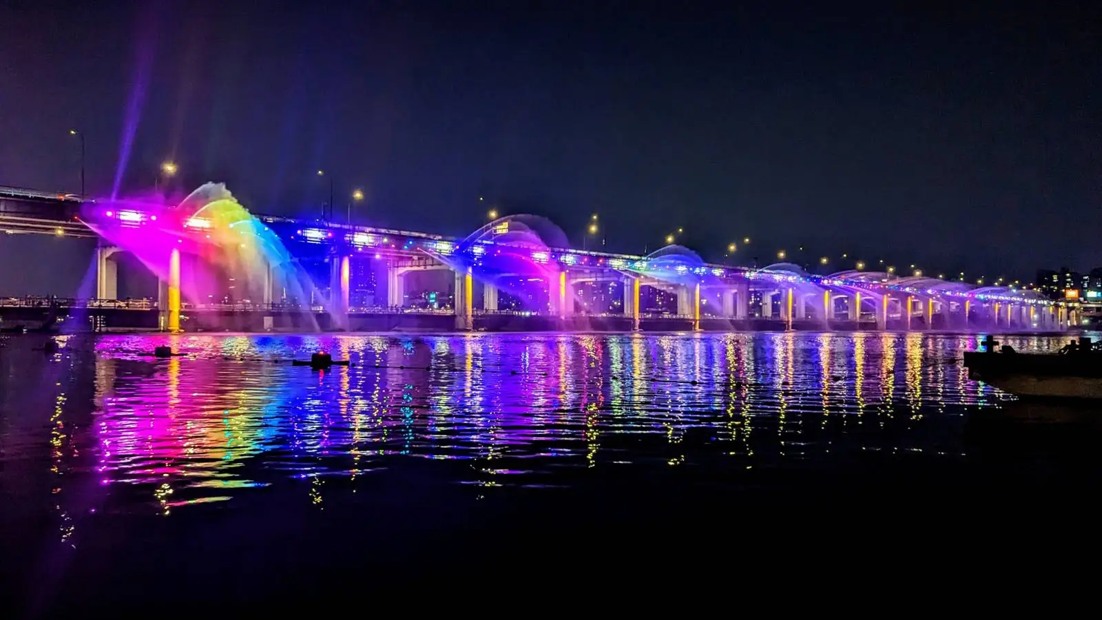 Descubre el Puente de Banpo en Seúl: show nocturno de fuentes y luces sobre el río Han, con vistas desde el parque Banpo Hangang. De abril a octubre.