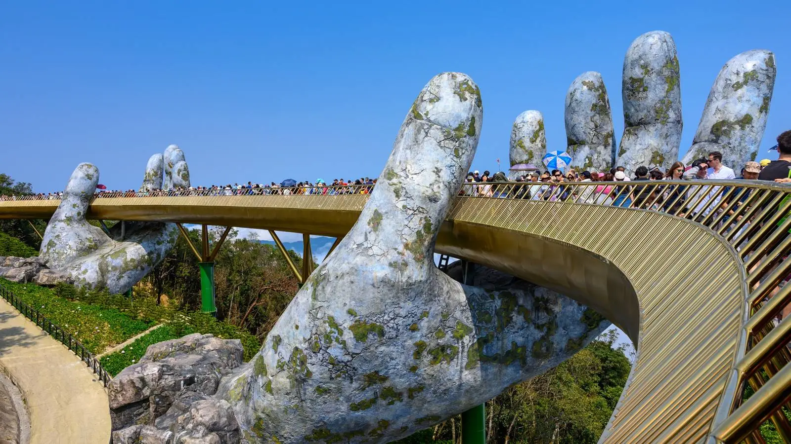 Le pont se dresse au complexe de Ba Na Hills, en altitude, près de la ville vietnamienne de Da Nang. On y accède par un téléphérique exceptionnellement long, près de six kilomètres. Le pont relie l’une des stations du téléphérique à un jardin rempli de fleurs et d’arbres. C’est un raccourci pratique autant qu’une pièce maîtresse, qui épargne aux visiteurs une montée ardue.