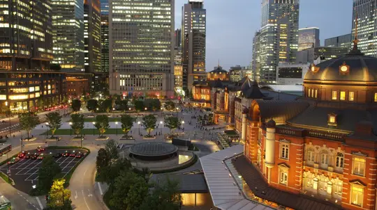 Деловой центр Токио с небоскрёбами, арт-инсталляциями, кафе, ресторанами и магазинами. Особенно красиво вечером — световые инсталляции и атмосферные улицы.