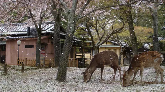 Это первое место, куда отправляются туристы. Здесь живёт около 1 200 оленей, считающихся священными посланниками богов. Их можно кормить специальным печеньем шика-сэнбэй, которое продаётся в парке. Эти грациозные животные свободно гуляют среди людей и прекрасно позируют для фото.