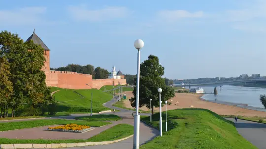 От железнодорожного и автовокзала путь занимает около 25–30 минут. Дорога пролегает через исторические кварталы и набережную Волхова, что делает прогулку приятной и познавательной.