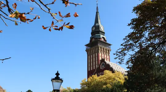 Главный акцент комплекса — башня высотой 76 метров. Богатый декор, резные элементы и узорчатые окна создают выразительный силуэт, который легко узнаётся издалека.