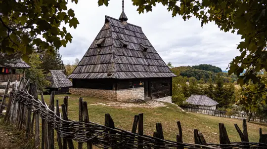 Вокруг церкви расположены десятки аккуратно восстановленных деревянных домов Златиборского региона. Даты постройки разных объектов отличаются, а самая старая изба относится к 1882 году. Внутри сохранились оригинальные интерьеры, мебель и предметы быта, что помогает понять, как жили жители Сербии в горной местности более века назад.