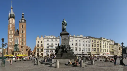 Одна из крупнейших средневековых площадей Европы. Это место всегда оживлённое: здесь проходят ярмарки, фестивали, уличные концерты. На территории возвышается Мариацкий костёл, известный своим готическим алтарём и ежечасным трубным сигналом — хейналом. Рядом расположены торговые ряды Сукеннице и Ратушная башня, а вокруг — множество старинных дворцов, церквей и выставок.