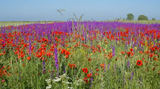 Здесь поля маков располагаются вдоль дорог и соседствуют с золотистыми пшеничными полями, образуя необычную палитру оттенков.