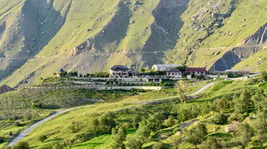 Здесь можно увидеть традиционные кавказские террасы с полями и пастбищами.