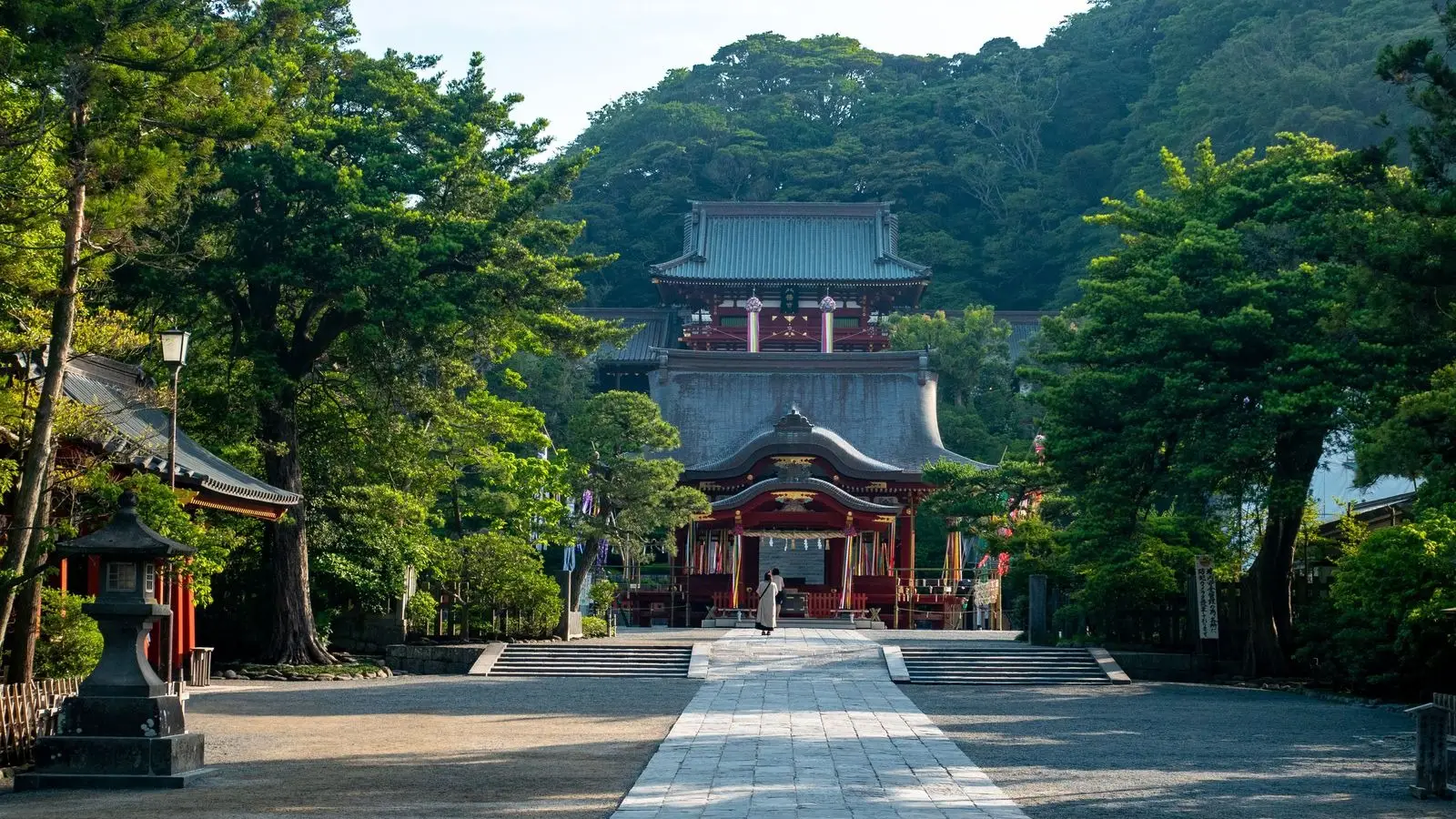 У входа сохранилось особенное место — крытая сцена, на которой в 1186 году по приказу сёгуна Ёритомо исполняла танец Сидзука — возлюбленная его брата Ёсицунэ. Эта трагическая история вдохновила японских поэтов и театральных драматургов на создание множества произведений.