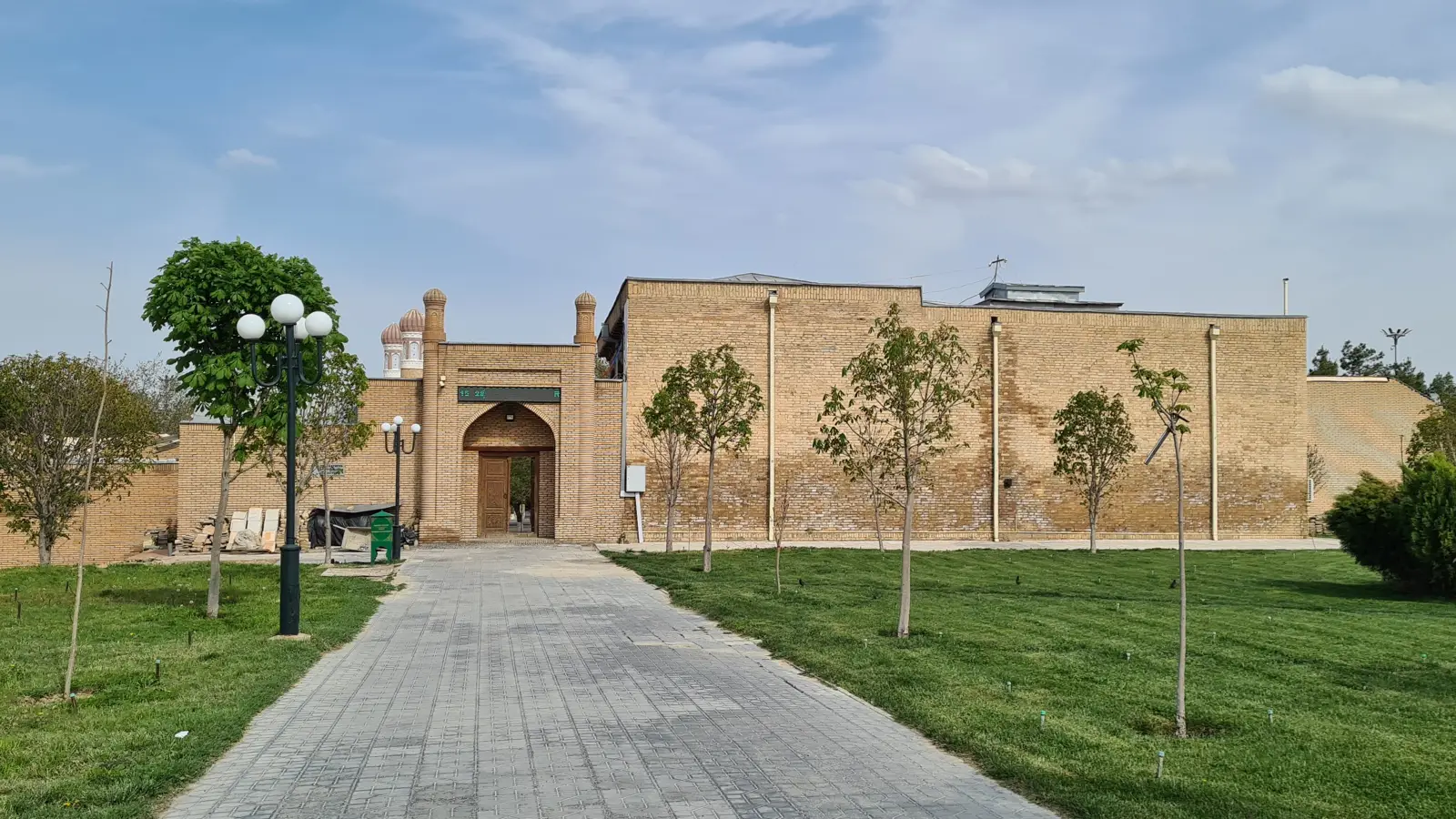Декор минималистичен: стены выложены из обожжённого кирпича, а арки украшены поливной резной терракотой. Этот аскетичный облик подчеркивает духовную атмосферу памятника.