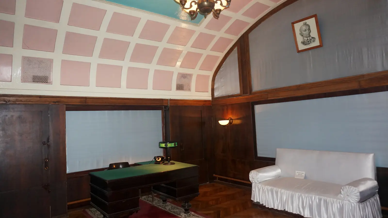 Главный зал, где воссоздана обстановка военного времени: массивный стол, карта фронтов, телефонная связь и личные вещи руководителя. Всё оформлено с исторической точностью.