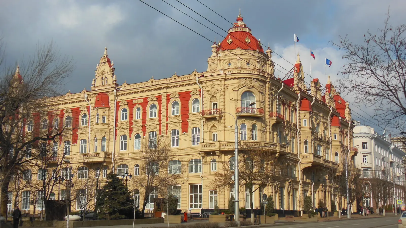 Городская дума — эффектное здание с лепниной и колоннами.