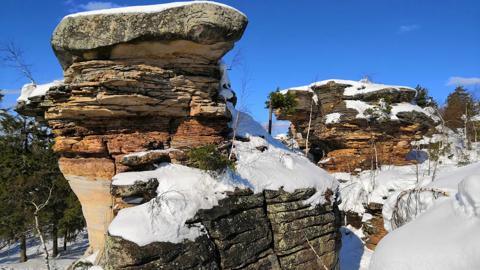 Зимой это место превращается в настоящую ледяную сказку. Снег и иней придают каменным образованиям волшебный вид.