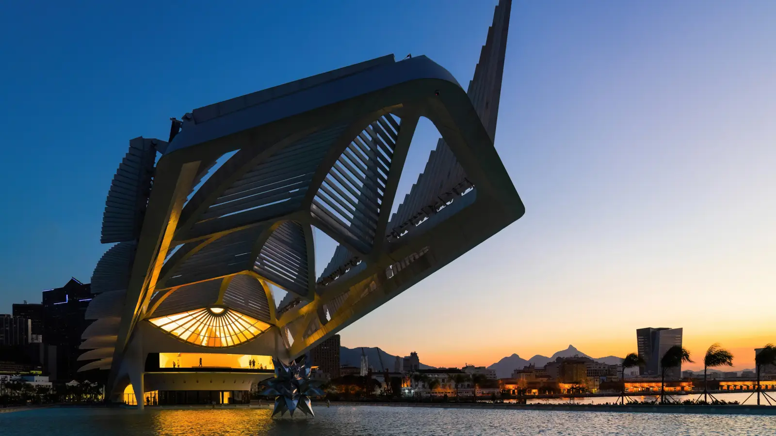 Здание музея расположено в районе Пьер-Мауа, прямо у залива Гуанабара. Оно будто парит над водой, напоминая морское существо с расправленными крыльями. Конструкция отражает тему устойчивого развития: на крыше установлены солнечные панели, которые поворачиваются вслед за солнцем, а вокруг — водное зеркало, охлаждающее воздух и создающее эффект невесомости.