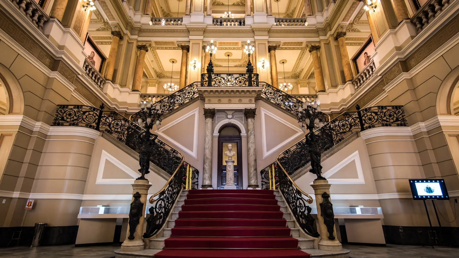 При входе посетителей встречает величественный мраморный вестибюль с широкими лестницами, витражами и старинными люстрами. Атмосфера торжественная и умиротворённая — место располагает к размышлениям и изучению.