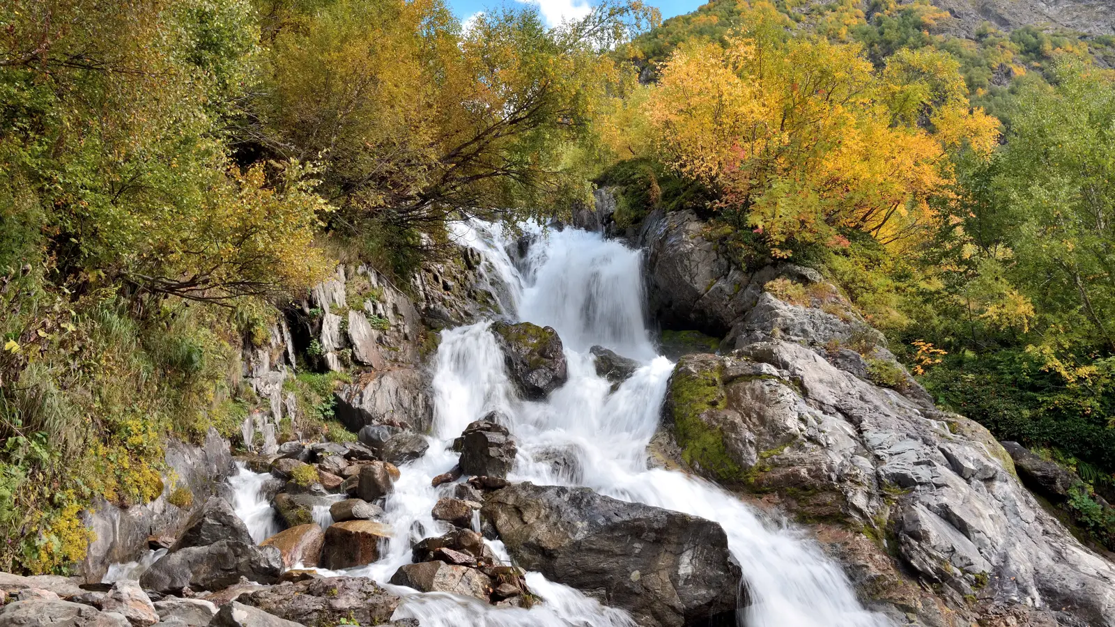 Место расположения — дно глубокого ущелья Домбай-Ульген, которое славится богатым биоразнообразием, чистотой воздуха и оригинальностью рельефа. Основной источник воды — таяние ледников и дождей, что объясняет разницу в объёме и интенсивности потока в разные времена года.