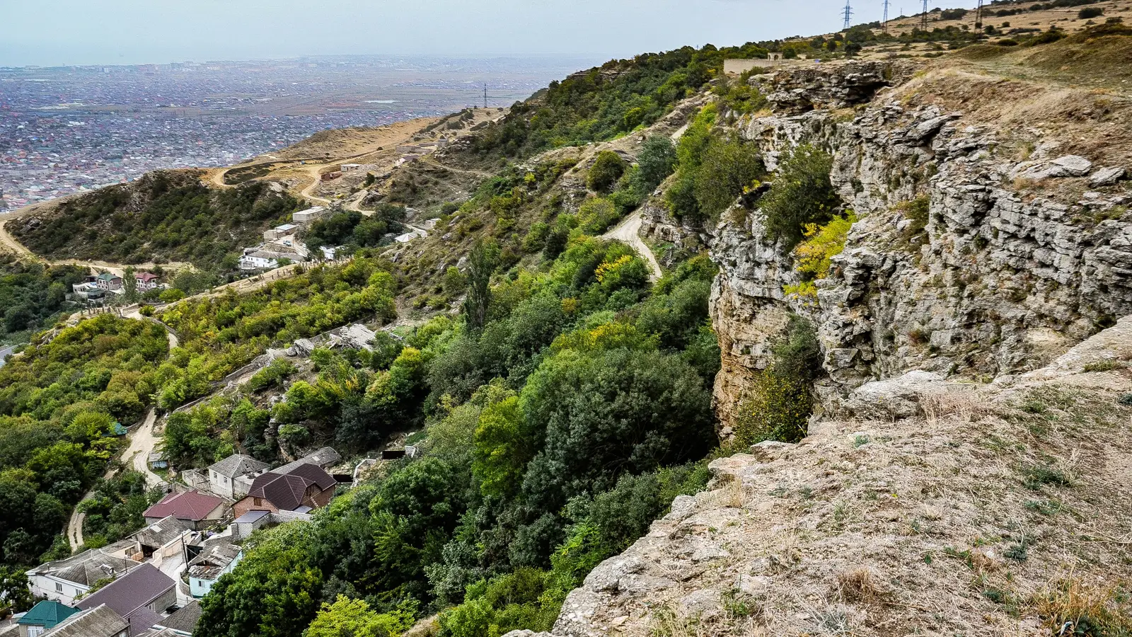 По пути вы пройдёте через жилые кварталы и небольшие зелёные склоны, где уже начинают открываться виды на город и Каспийское море.