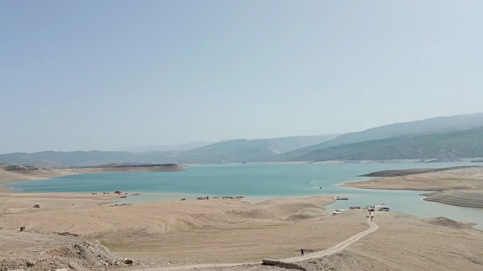 Вода имеет ярко-бирюзовый оттенок благодаря протеканию рек через медьсодержащие породы, создавая эффект лазурного моря среди гор.