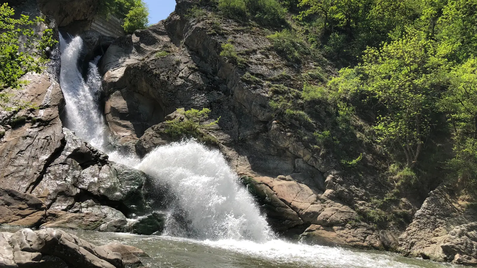 Верхний — около 3 метров, вода с шумом обрушивается на скальные выступы, создавая пенные потоки.