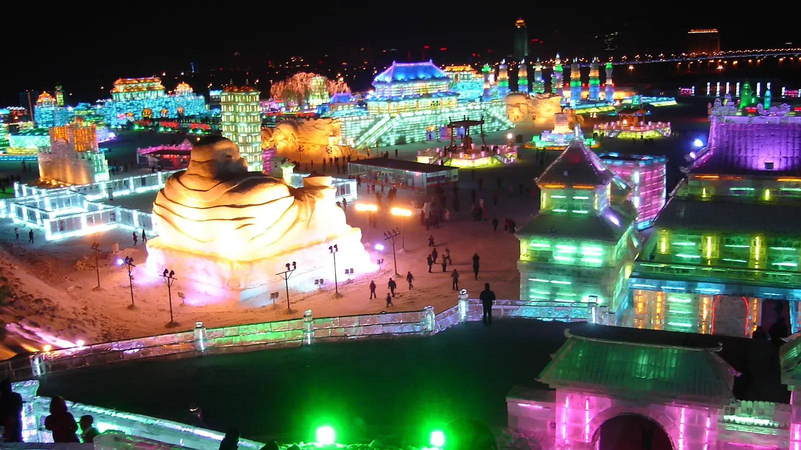 Ice and Snow World — настоящая ледяная страна. Тут строят огромные здания изо льда: замки, мосты, башни. Всё это сверкает цветными огнями. Каждый год конструкции меняются, и их делают заново изо льда реки Сонгхуа.